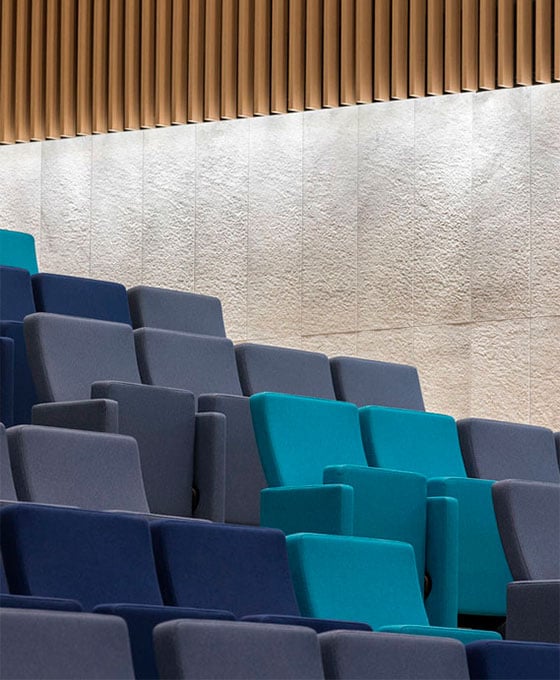 L’une des particularités de cet auditorium est la variété des couleurs choisies pour le revêtement des sièges, le bleu étant la couleur principale et générant un effet de contraste avec les tons chauds des murs et du plafond, ainsi qu’entre les sièges eux-mêmes. Le choix de cette échelle monochromatique avec différentes nuances et saturations donne à l’espace un sentiment d’unité et d’harmonie, également présent dans d’autres éléments du complexe, et parvient à générer la sensation d’être dans un espace unique et original, totalement en accord avec le reste du bâtiment.