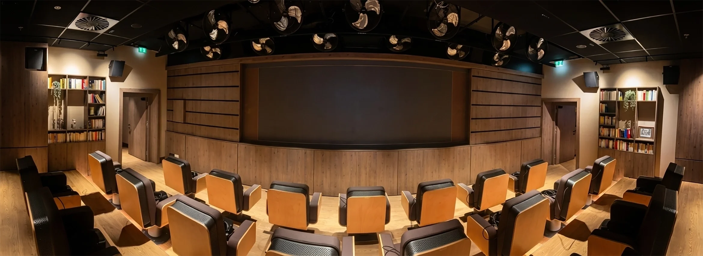 La salle est équipée de 30 fauteuils Woody RT 2312/M entièrement personnalisés, dotés d’une rotation à 360º et d’une intégration technologique complète. Chaque siège intègre la technologie de réalité virtuelle dans sa propre structure, avec la CPU logée dans le dossier et le câblage dissimulé dans le piètement, sans compromis sur le confort ni l’esthétique.